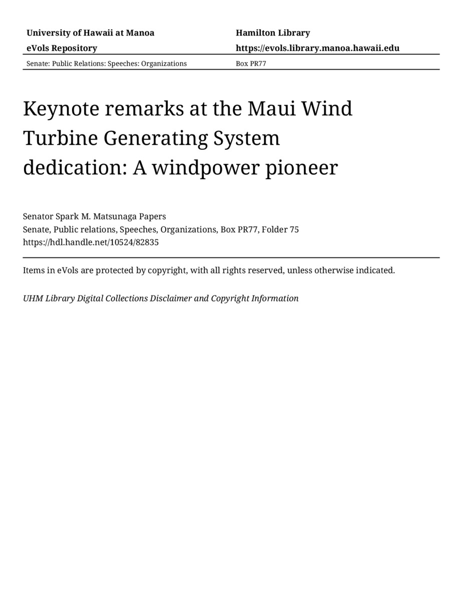 - Keynote remarks at the Maui Wind Turbine Generating System dedication: A windpower pioneer