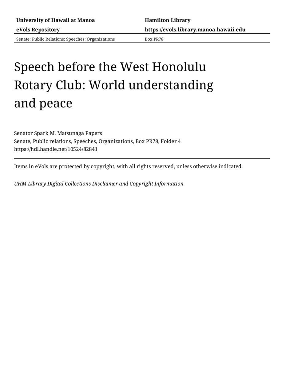 Speech before the West Honolulu Rotary Club: World understanding and peace