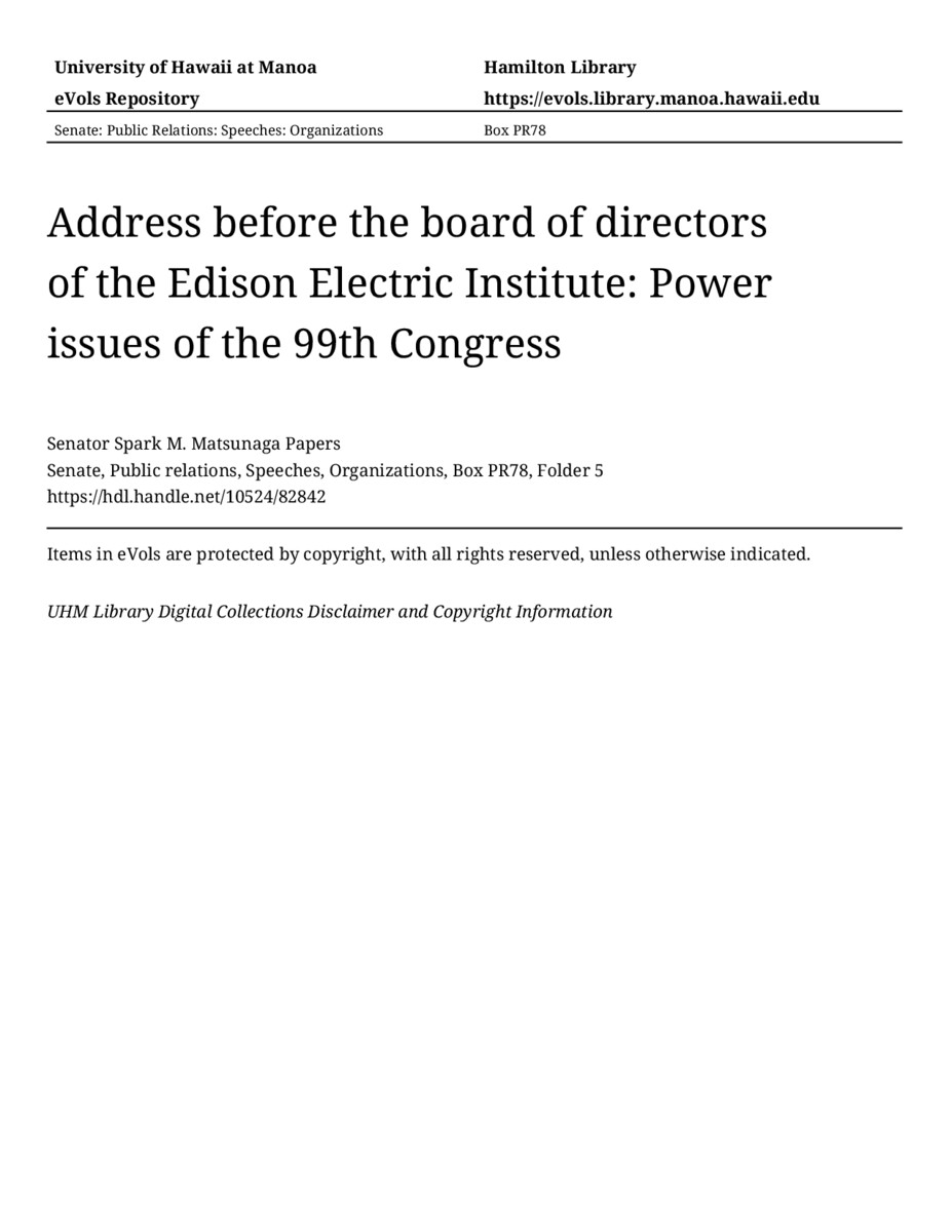 - Address before the board of directors of the Edison Electric Institute: Power issues of the 99th Congress
