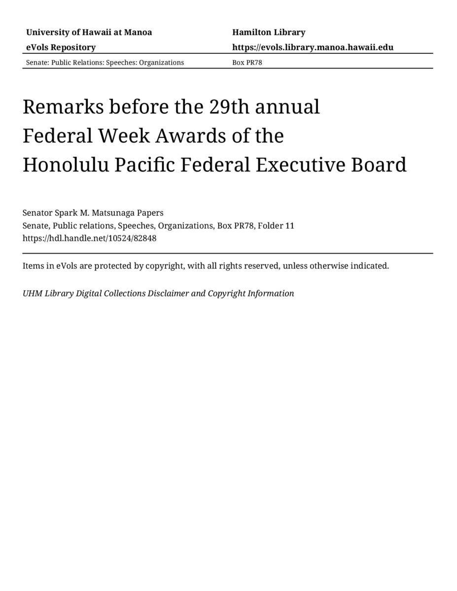 - Remarks before the 29th annual Federal Week Awards of the Honolulu Pacific Federal Executive Board