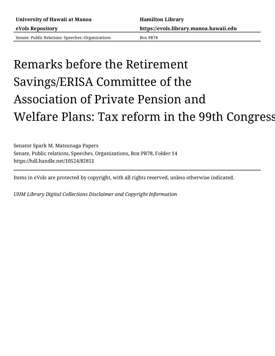 Remarks before the Retirement Savings/ERISA Committee of the Association of Private Pension and Welfare Plans: Tax reform in the 99th Congress, 04/25/85, Senate, Public relations, Speeches, Organizations, Box PR78, Folder 14, Senator Spark M. Matsunaga Papers, Hawaiʻi Congressional Papers Collection, University of Hawaiʻi at Mānoa Library, Honolulu, HI. https://congressarchives.org/catalog/10524_82851 (accessed March 20, 2026).