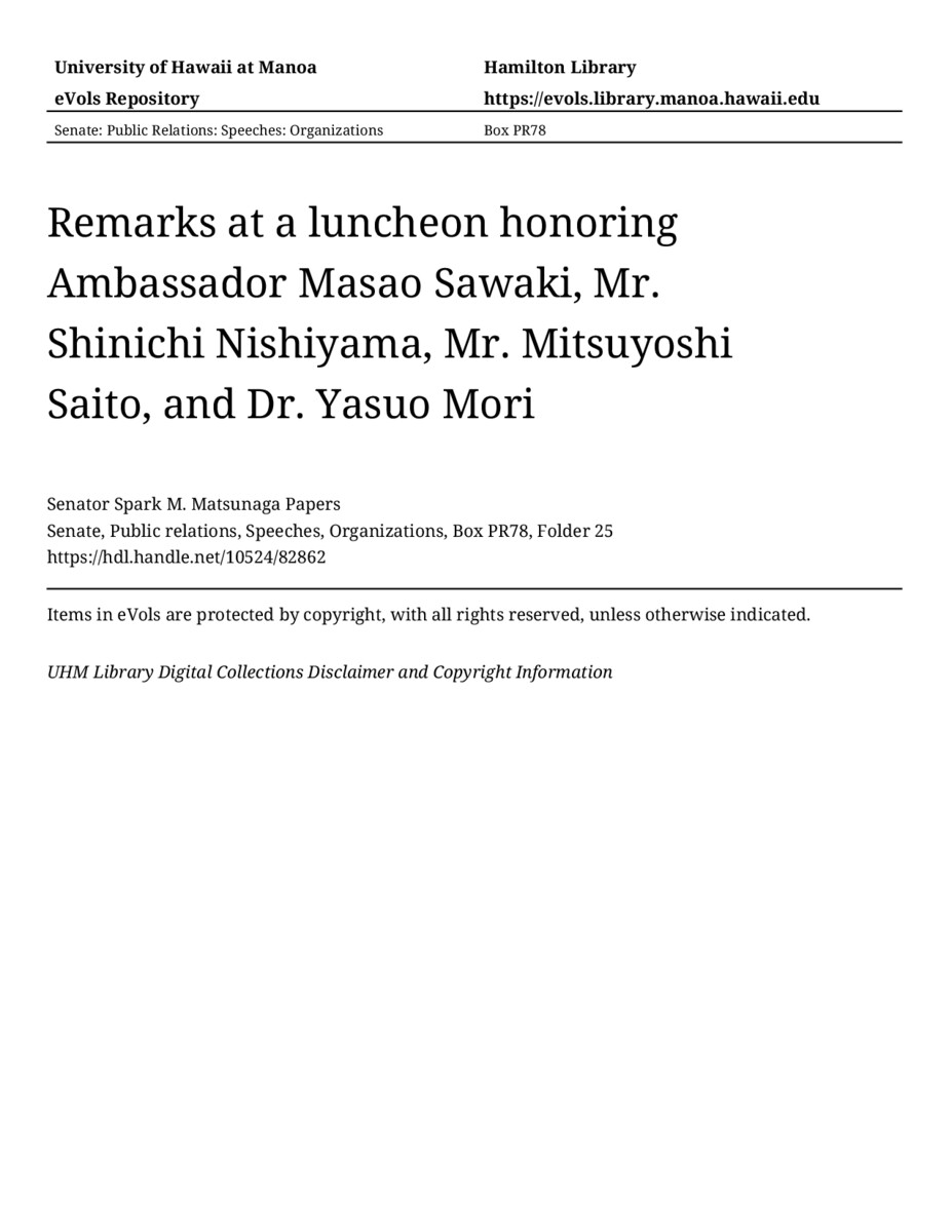 - Remarks at a luncheon honoring Ambassador Masao Sawaki, Mr. Shinichi Nishiyama, Mr. Mitsuyoshi Saito, and Dr. Yasuo Mori