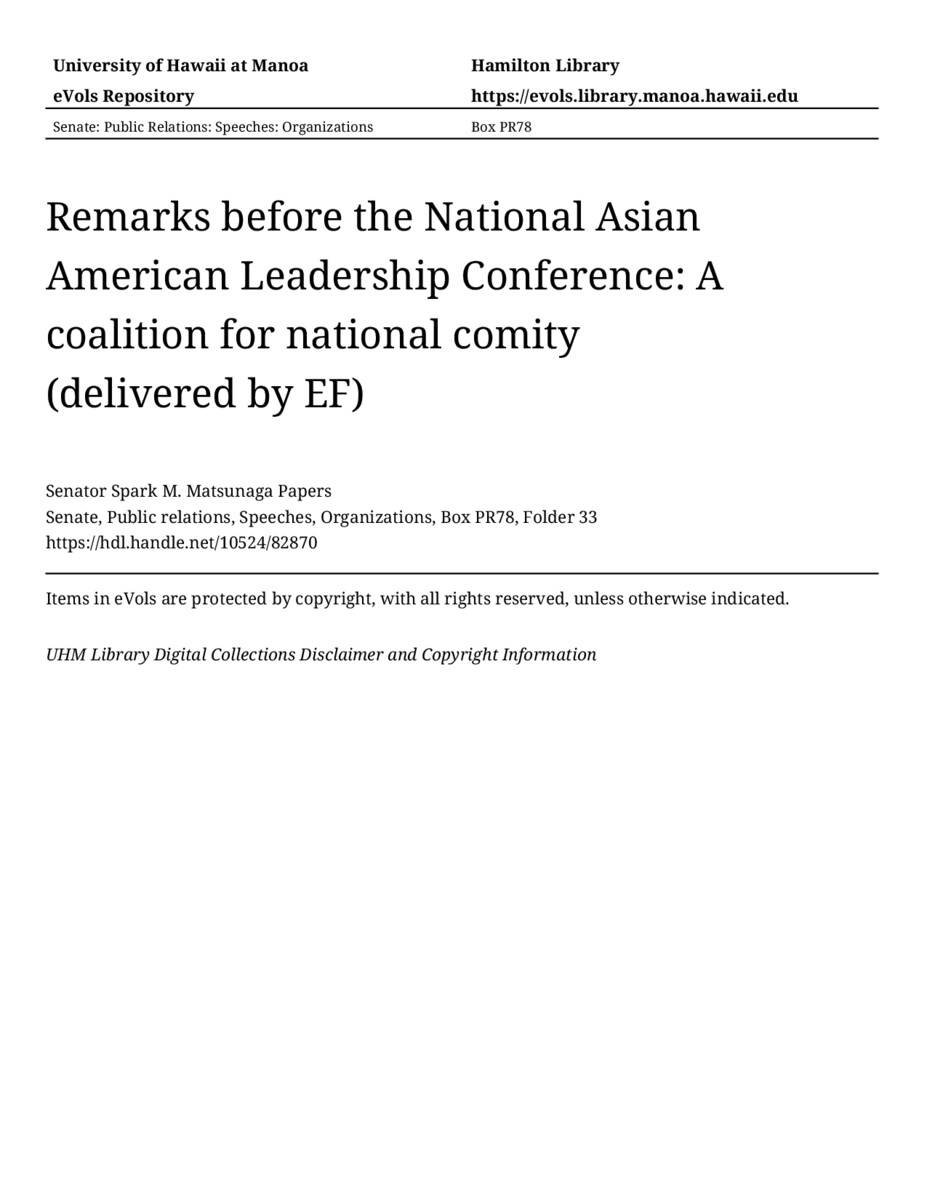 Remarks before the National Asian American Leadership Conference: A coalition for national comity (delivered by EF)