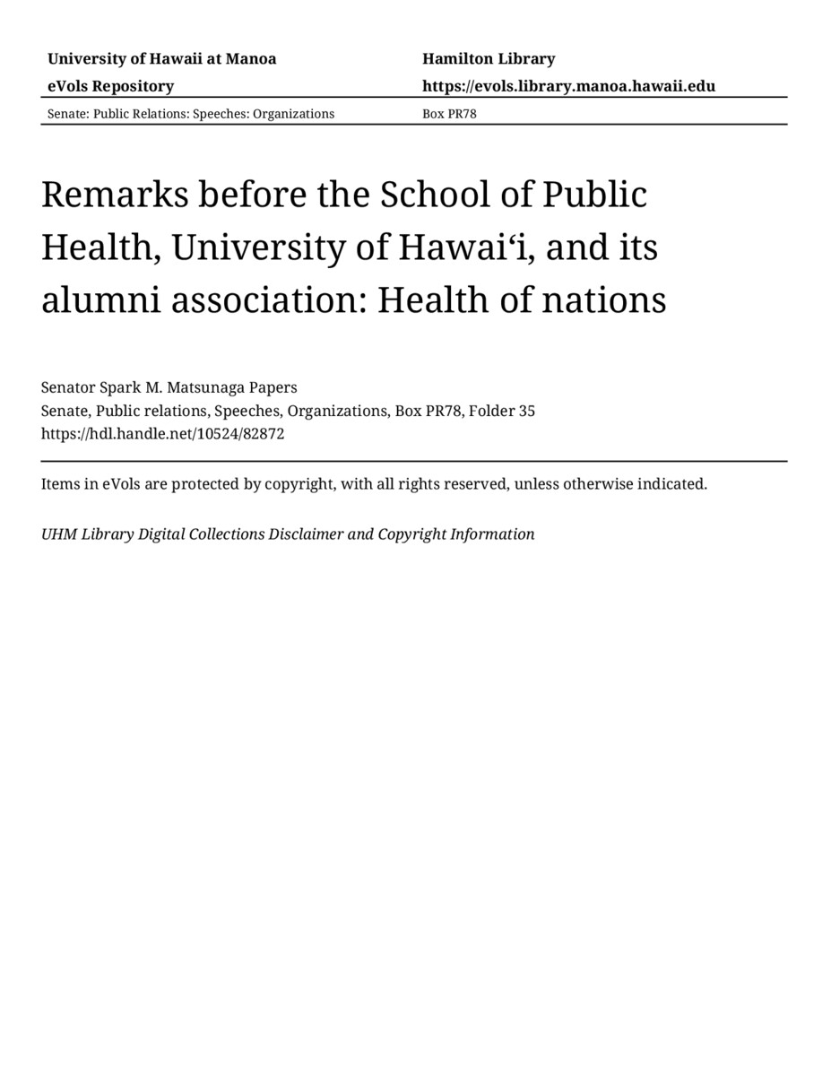 - Remarks before the School of Public Health, University of Hawaiʻi, and its alumni association: Health of nations