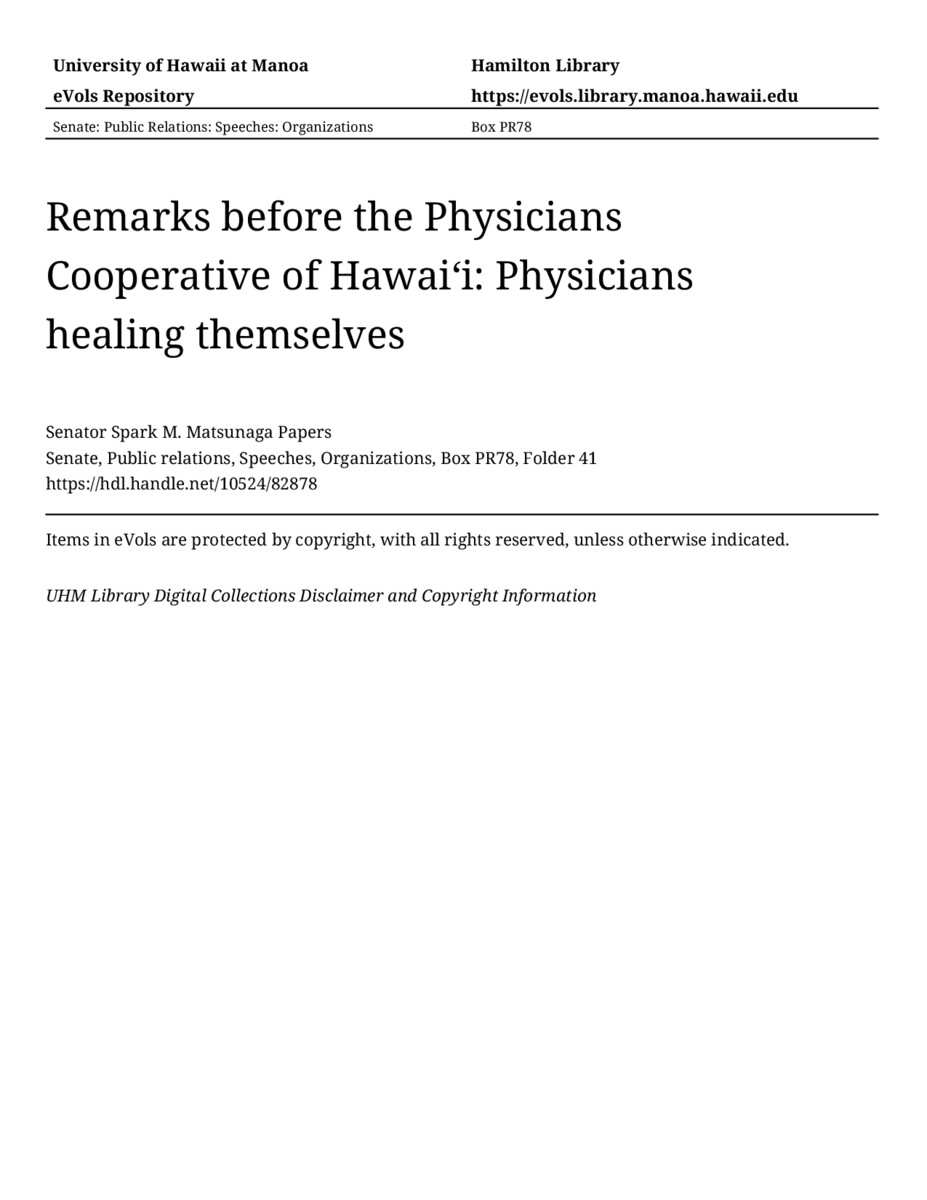 Remarks before the Physicians Cooperative of Hawaiʻi: Physicians healing themselves