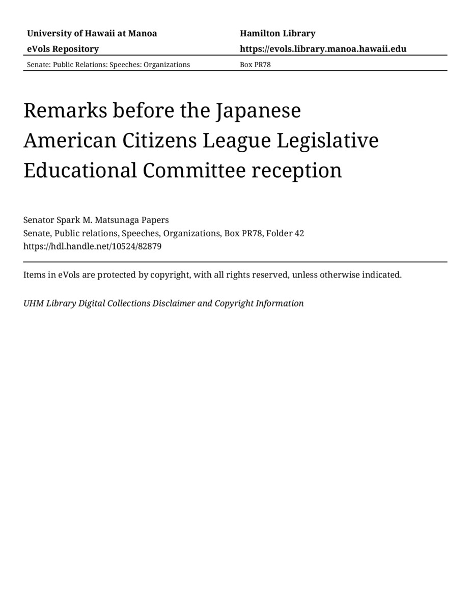 - Remarks before the Japanese American Citizens League Legislative Educational Committee reception
