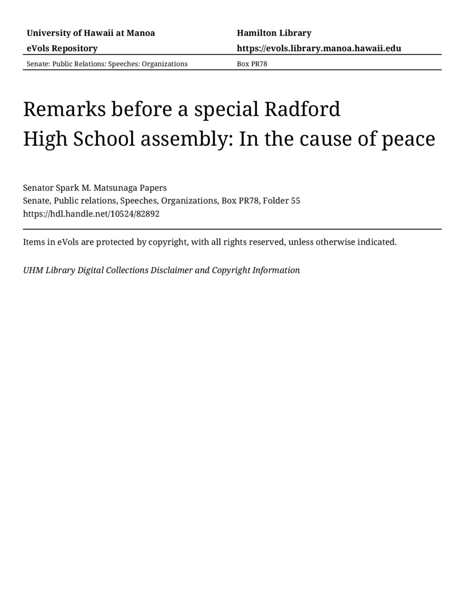 - Remarks before a special Radford High School assembly: In the cause of peace