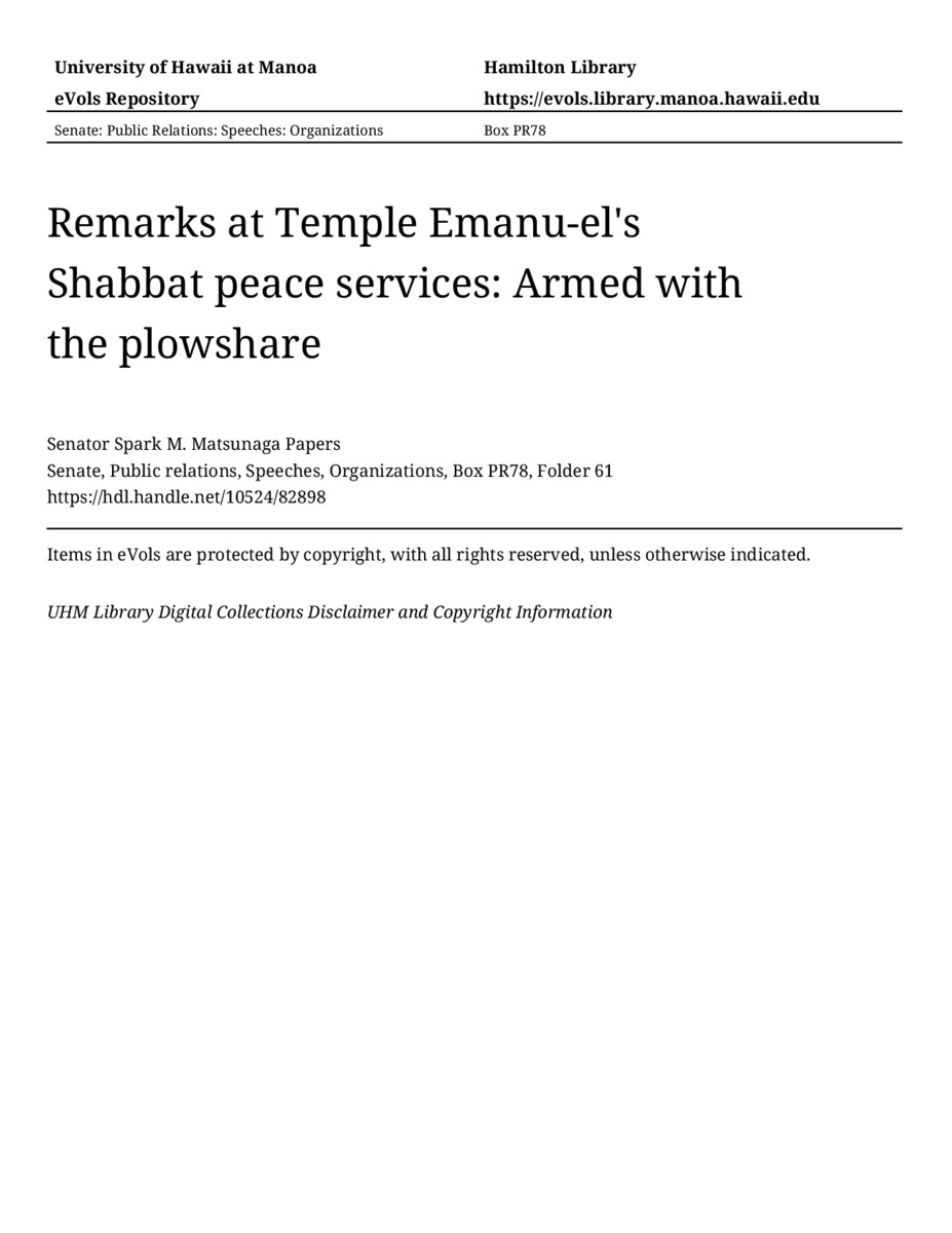 - Remarks at Temple Emanu-el's Shabbat peace services: Armed with the plowshare