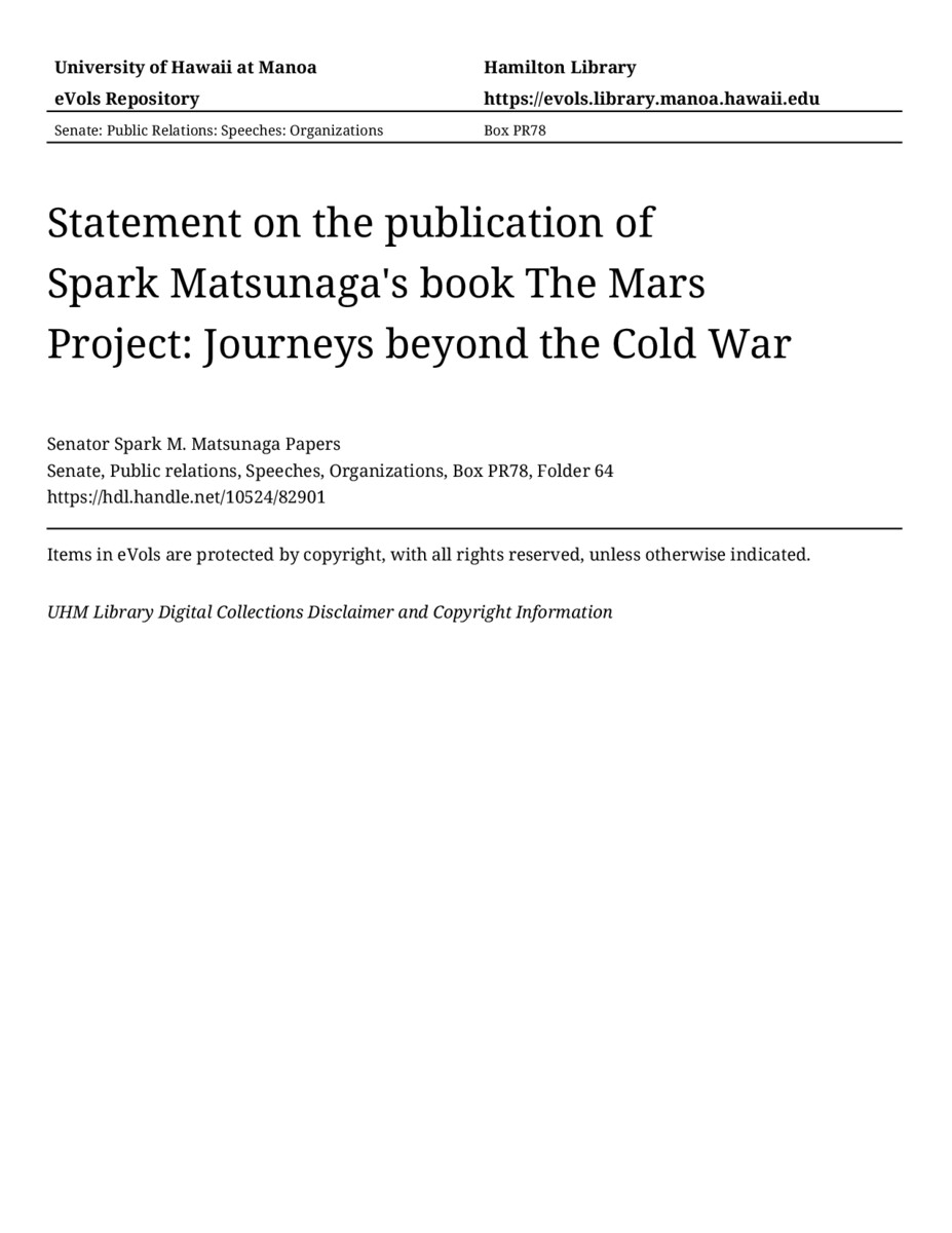 - Statement on the publication of Spark Matsunaga's book The Mars Project: Journeys beyond the Cold War