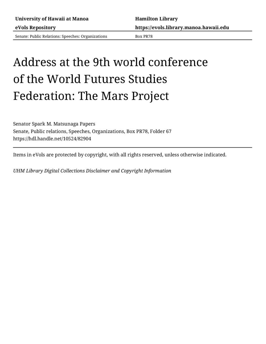 - Address at the 9th world conference of the World Futures Studies Federation: The Mars Project
