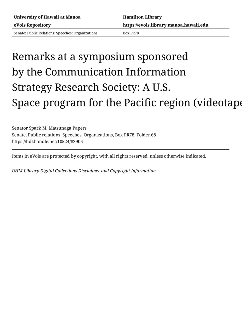 Remarks at a symposium sponsored by the Communication Information Strategy Research Society: A U.S. Space program for the Pacific region (videotaped), 05/30/86, Senate, Public relations, Speeches, Organizations, Box PR78, Folder 68, Senator Spark M. Matsunaga Papers, Hawaiʻi Congressional Papers Collection, University of Hawaiʻi at Mānoa Library, Honolulu, HI. https://congressarchives.org/catalog/10524_82905 (accessed March 20, 2026).