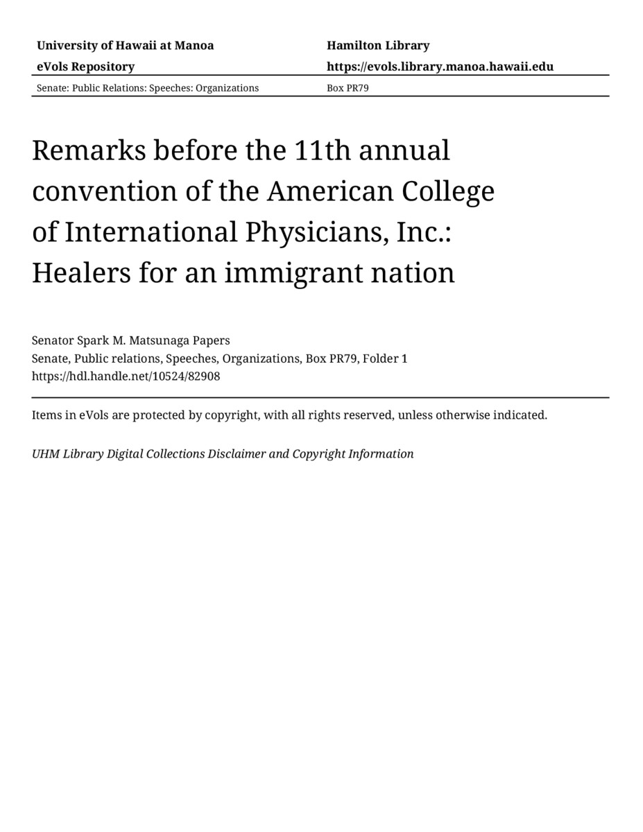 - Remarks before the 11th annual convention of the American College of International Physicians, Inc.: Healers for an immigrant nation