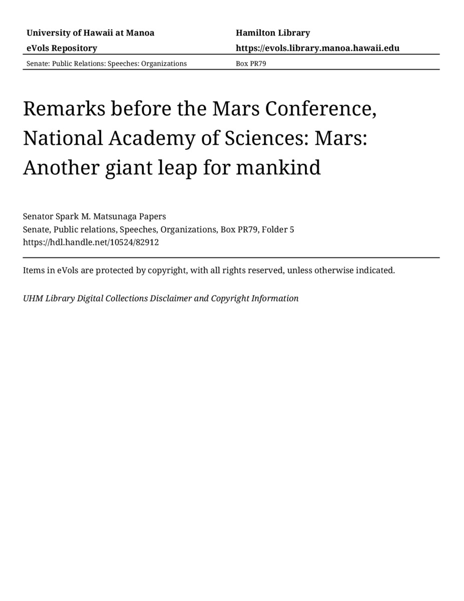 - Remarks before the Mars Conference, National Academy of Sciences: Mars: Another giant leap for mankind