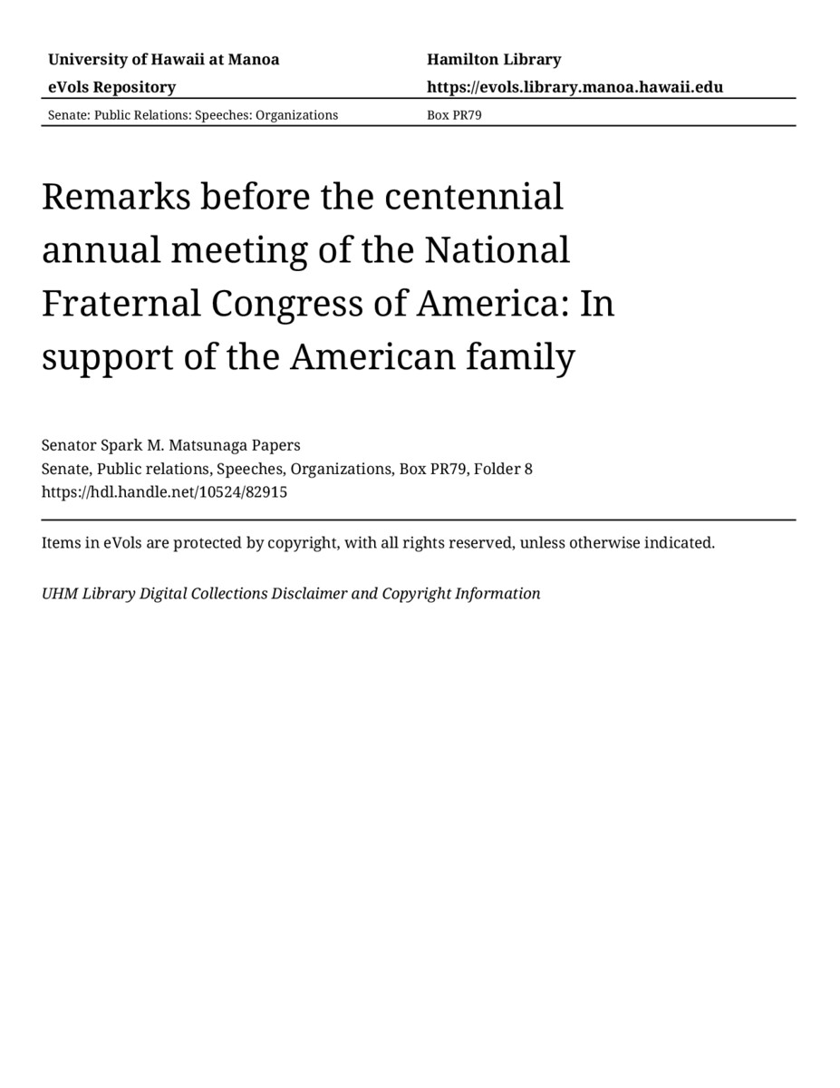 - Remarks before the centennial annual meeting of the National Fraternal Congress of America: In support of the American family