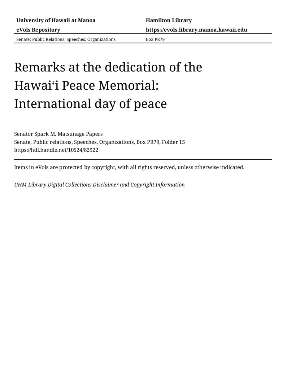 - Remarks at the dedication of the Hawaiʻi Peace Memorial: International day of peace
