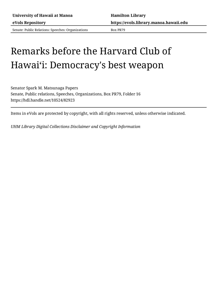 - Remarks before the Harvard Club of Hawaiʻi: Democracy's best weapon