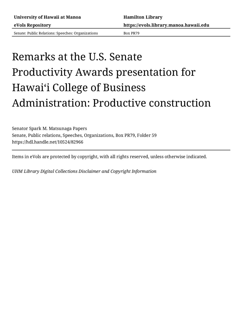 - Remarks at the U.S. Senate Productivity Awards presentation for Hawaiʻi College of Business Administration: Productive construction