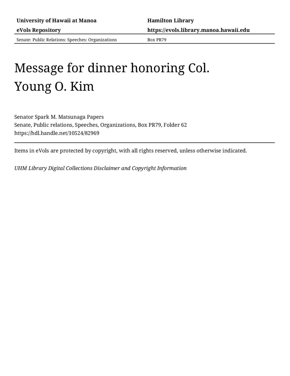 Message for dinner honoring Col. Young O. Kim, 09/10/87, Senate, Public relations, Speeches, Organizations, Box PR79, Folder 62, Senator Spark M. Matsunaga Papers, Hawaiʻi Congressional Papers Collection, University of Hawaiʻi at Mānoa Library, Honolulu, HI. https://congressarchives.org/catalog/10524_82969 (accessed March 20, 2026).