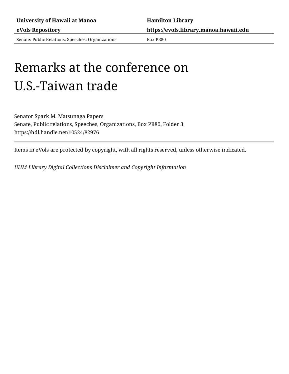 Remarks at the conference on U.S.-Taiwan trade, 10/23/87, Senate, Public relations, Speeches, Organizations, Box PR80, Folder 3, Senator Spark M. Matsunaga Papers, Hawaiʻi Congressional Papers Collection, University of Hawaiʻi at Mānoa Library, Honolulu, HI. https://congressarchives.org/catalog/10524_82976 (accessed March 20, 2026).