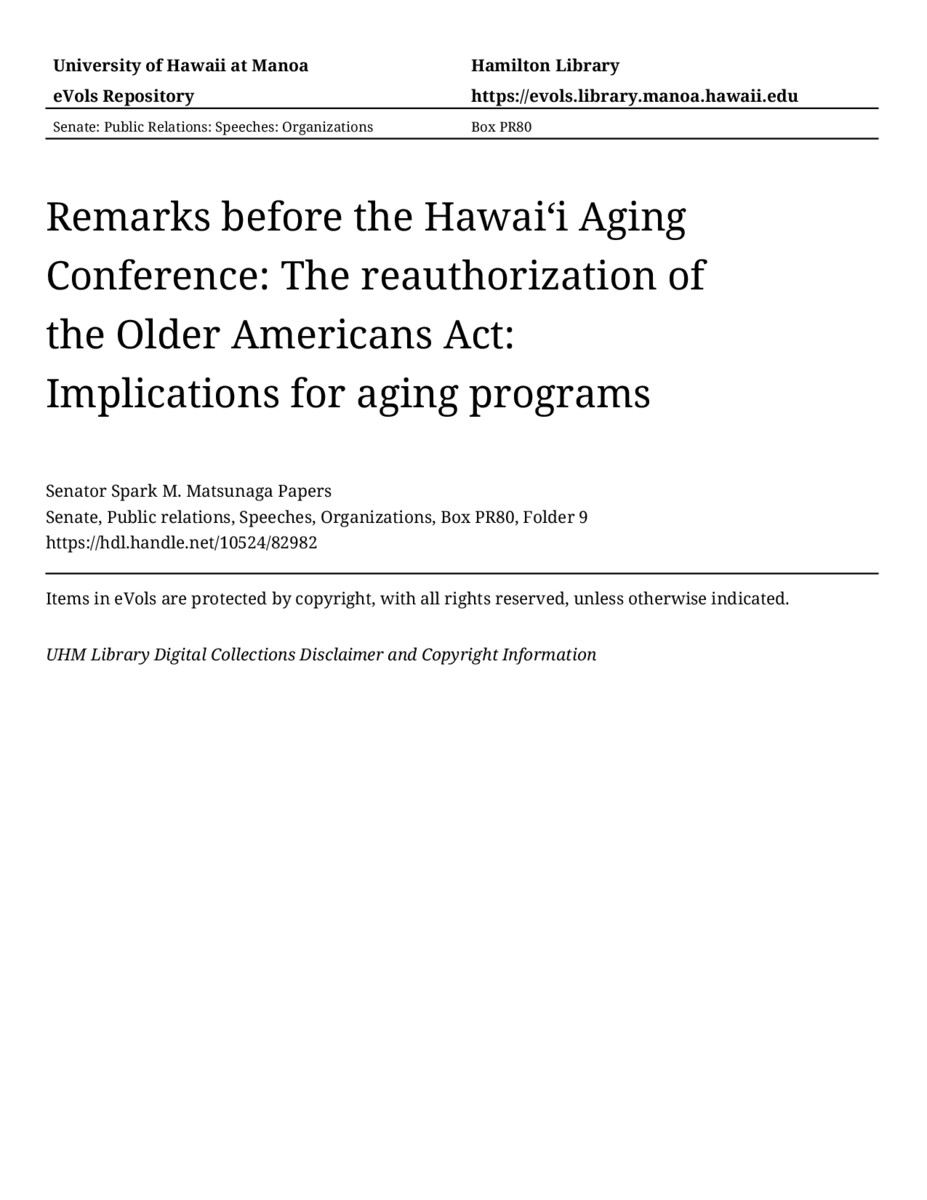 - Remarks before the Hawaiʻi Aging Conference: The reauthorization of the Older Americans Act: Implications for aging programs