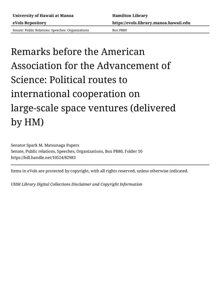 Remarks before the American Association for the Advancement of Science: Political routes to international cooperation on large-scale space ventures (delivered by HM), 02/12/88, Senate, Public relations, Speeches, Organizations, Box PR80, Folder 10, Senator Spark M. Matsunaga Papers, Hawaiʻi Congressional Papers Collection, University of Hawaiʻi at Mānoa Library, Honolulu, HI. https://congressarchives.org/catalog/10524_82983 (accessed March 19, 2026).