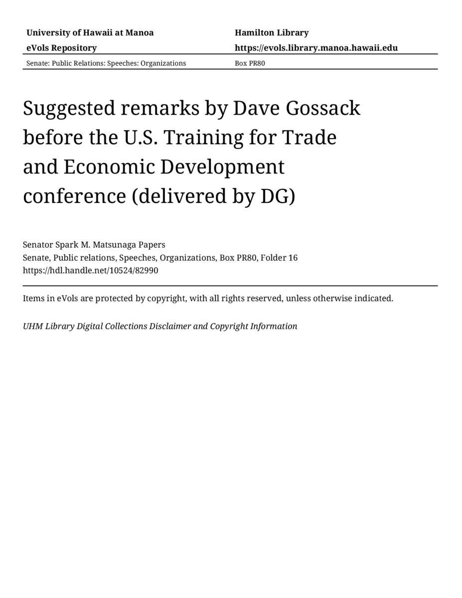 - Suggested remarks by Dave Gossack before the U.S. Training for Trade and Economic Development conference (delivered by DG)