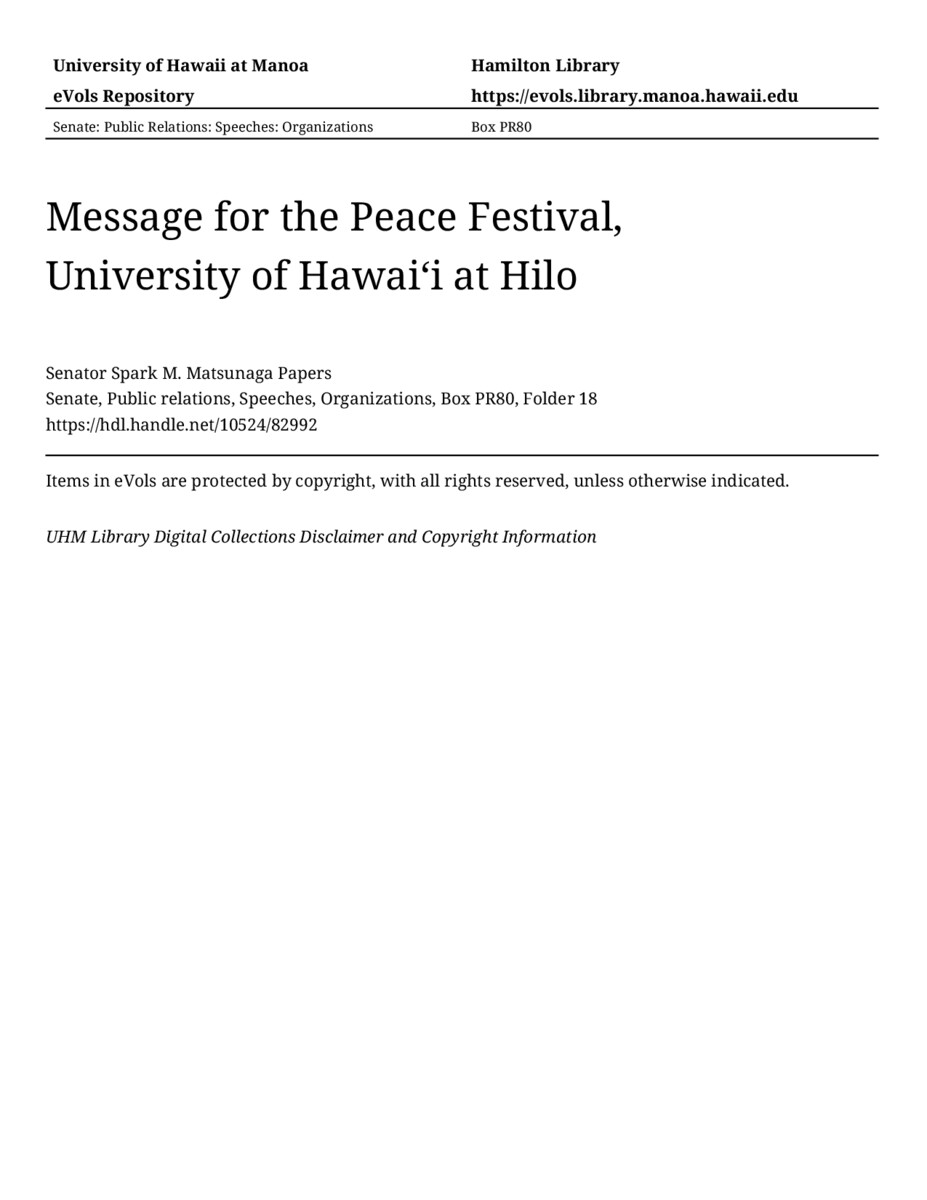 Message for the Peace Festival, University of Hawaiʻi at Hilo, 05/01/88, Senate, Public relations, Speeches, Organizations, Box PR80, Folder 18, Senator Spark M. Matsunaga Papers, Hawaiʻi Congressional Papers Collection, University of Hawaiʻi at Mānoa Library, Honolulu, HI. https://congressarchives.org/catalog/10524_82992 (accessed March 19, 2026).