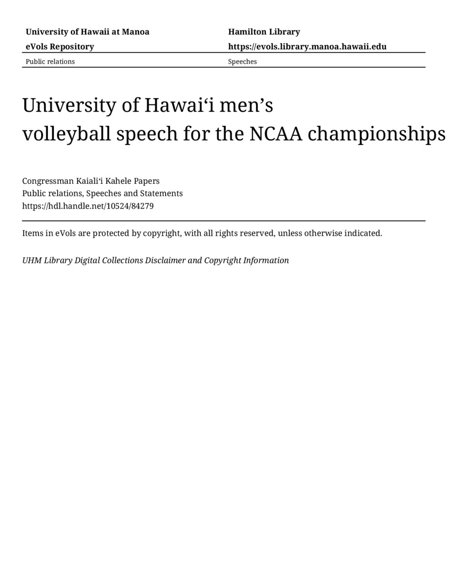 University of Hawaiʻi men’s volleyball speech for the NCAA championships, 5/12/2021, Public relations, Speeches and Statements, Congressman Kaialiʻi Kahele Papers, Hawaiʻi Congressional Papers Collection, University of Hawaiʻi at Mānoa Library, Honolulu, HI. https://congressarchives.org/catalog/10524_84279 (accessed March 20, 2026).