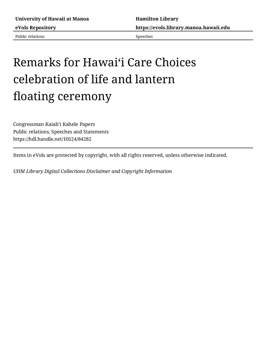 Remarks for Hawaiʻi Care Choices celebration of life and lantern floating ceremony, 5/13/2021, Public relations, Speeches and Statements, Congressman Kaialiʻi Kahele Papers, Hawaiʻi Congressional Papers Collection, University of Hawaiʻi at Mānoa Library, Honolulu, HI. https://congressarchives.org/catalog/10524_84282 (accessed March 19, 2026).