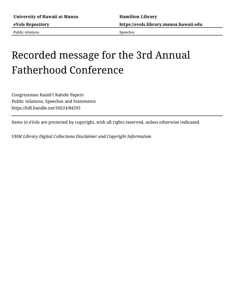 Recorded message for the 3rd Annual Fatherhood Conference, 6/18/2021, Public relations, Speeches and Statements, Congressman Kaialiʻi Kahele Papers, Hawaiʻi Congressional Papers Collection, University of Hawaiʻi at Mānoa Library, Honolulu, HI. https://congressarchives.org/catalog/10524_84295 (accessed March 19, 2026).