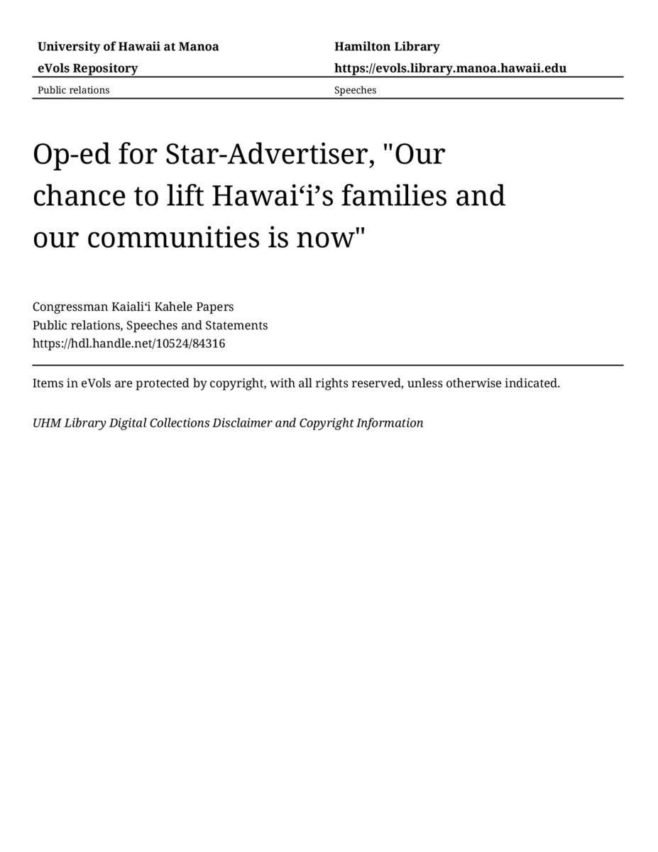 Op-ed for Star-Advertiser, "Our chance to lift Hawaiʻi’s families and our communities is now", 10/14/2021, Public relations, Speeches and Statements, Congressman Kaialiʻi Kahele Papers, Hawaiʻi Congressional Papers Collection, University of Hawaiʻi at Mānoa Library, Honolulu, HI. https://congressarchives.org/catalog/10524_84316 (accessed March 19, 2026).