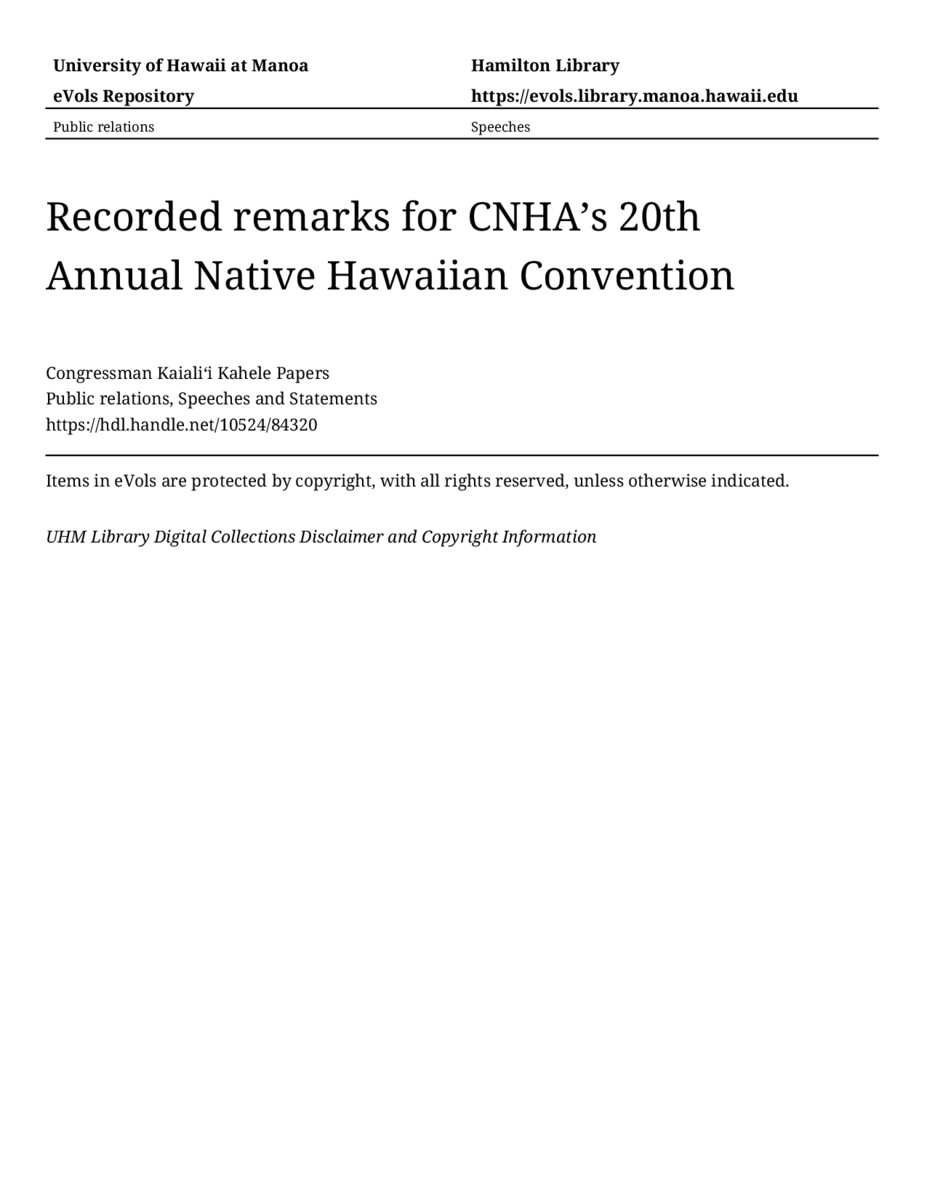 Recorded remarks for CNHA’s 20th Annual Native Hawaiian Convention, 10/26/2021, Public relations, Speeches and Statements, Congressman Kaialiʻi Kahele Papers, Hawaiʻi Congressional Papers Collection, University of Hawaiʻi at Mānoa Library, Honolulu, HI. https://congressarchives.org/catalog/10524_84320 (accessed March 18, 2026).