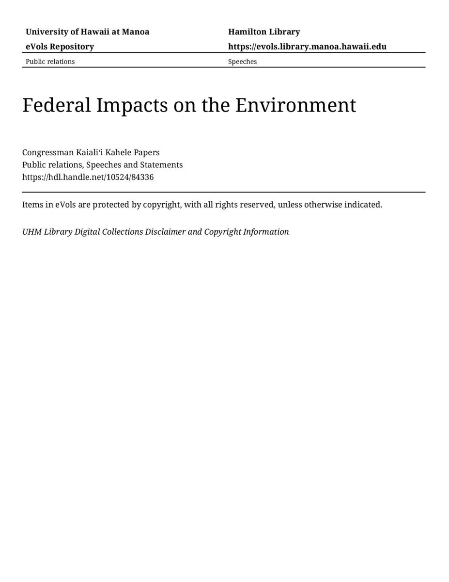 Federal Impacts on the Environment, 2/28/2022, Public relations, Speeches and Statements, Congressman Kaialiʻi Kahele Papers, Hawaiʻi Congressional Papers Collection, University of Hawaiʻi at Mānoa Library, Honolulu, HI. https://congressarchives.org/catalog/10524_84336 (accessed March 18, 2026).