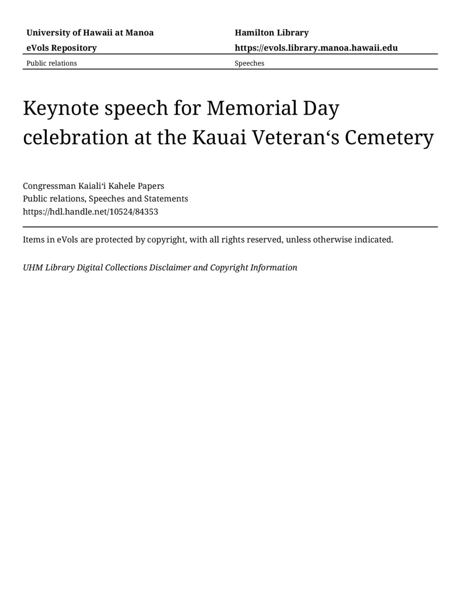 Keynote speech for Memorial Day celebration at the Kauai Veteranʻs Cemetery, 5/30/2022, Public relations, Speeches and Statements, Congressman Kaialiʻi Kahele Papers, Hawaiʻi Congressional Papers Collection, University of Hawaiʻi at Mānoa Library, Honolulu, HI. https://congressarchives.org/catalog/10524_84353 (accessed March 18, 2026).