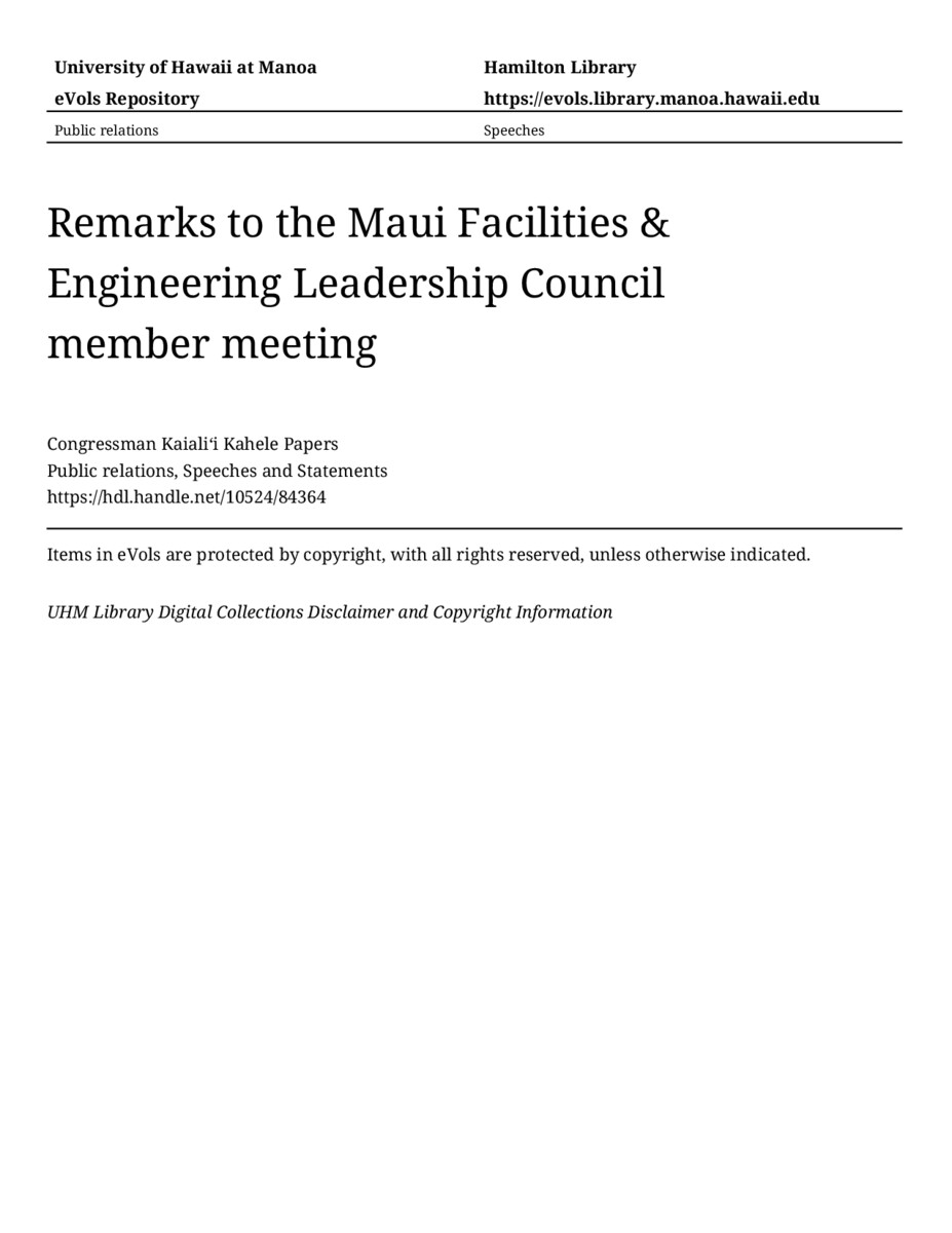 Remarks to the Maui Facilities & Engineering Leadership Council member meeting, 2021-2022, Public relations, Speeches and Statements, Congressman Kaialiʻi Kahele Papers, Hawaiʻi Congressional Papers Collection, University of Hawaiʻi at Mānoa Library, Honolulu, HI. https://congressarchives.org/catalog/10524_84364 (accessed March 20, 2026).