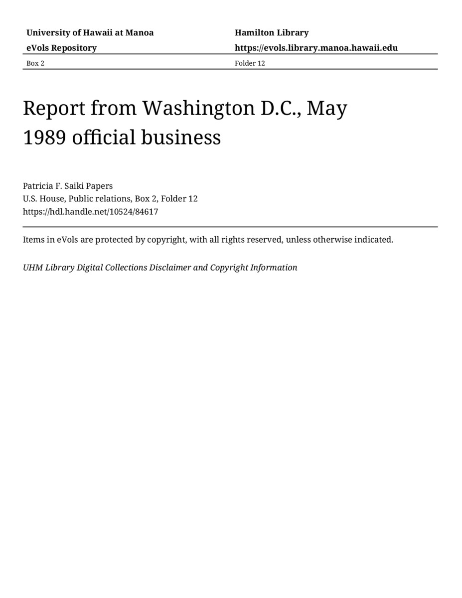 Report from Washington D.C., May 1989 official business, 1989-05, U.S. House, Public relations, Box 2, Folder 12, Patricia F. Saiki Papers, Hawaiʻi Congressional Papers Collection, University of Hawaiʻi at Mānoa Library, Honolulu, HI. https://congressarchives.org/catalog/10524_84617 (accessed March 19, 2026).